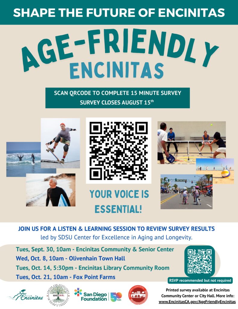 The City of Encinitas is conducting a study to address the future needs of the older adult population, ensuring the community remains vibrant and inclusive. This study is not only for those of us who are 50+ today but also for planning ahead. The city needs your input through a survey that covers facilities, services, parks, and transportation.